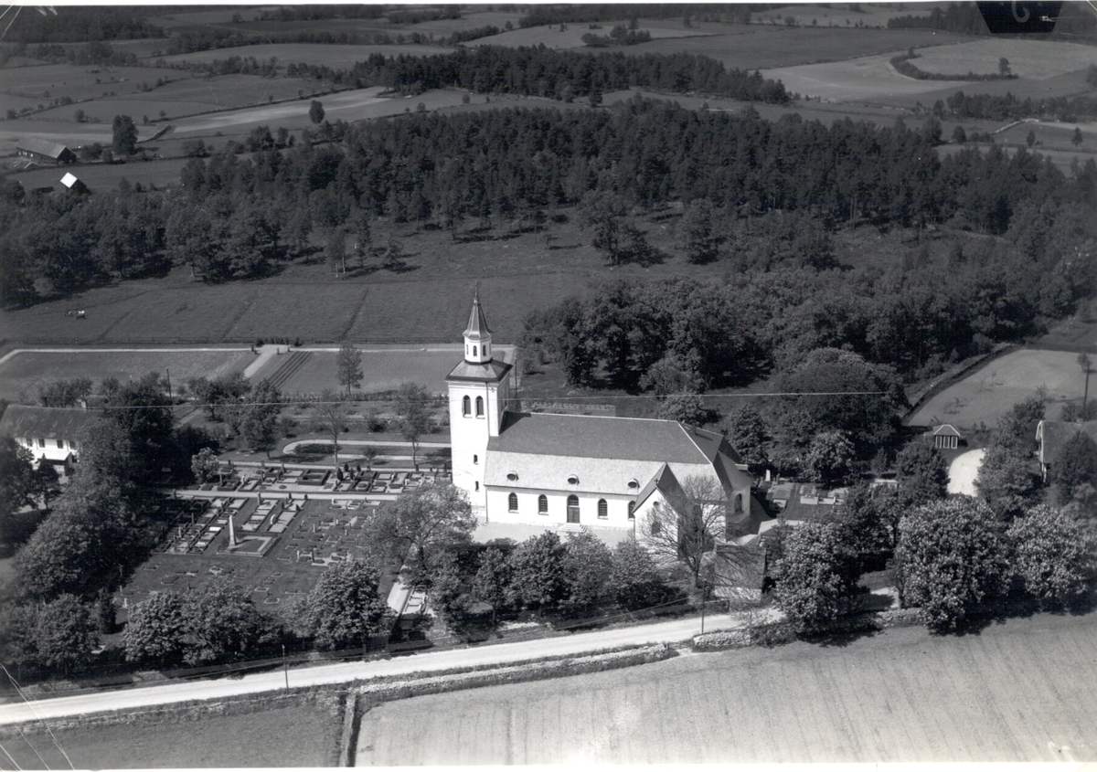 Flygfoto över Läckeby, Kyrkan och kyrkogården.