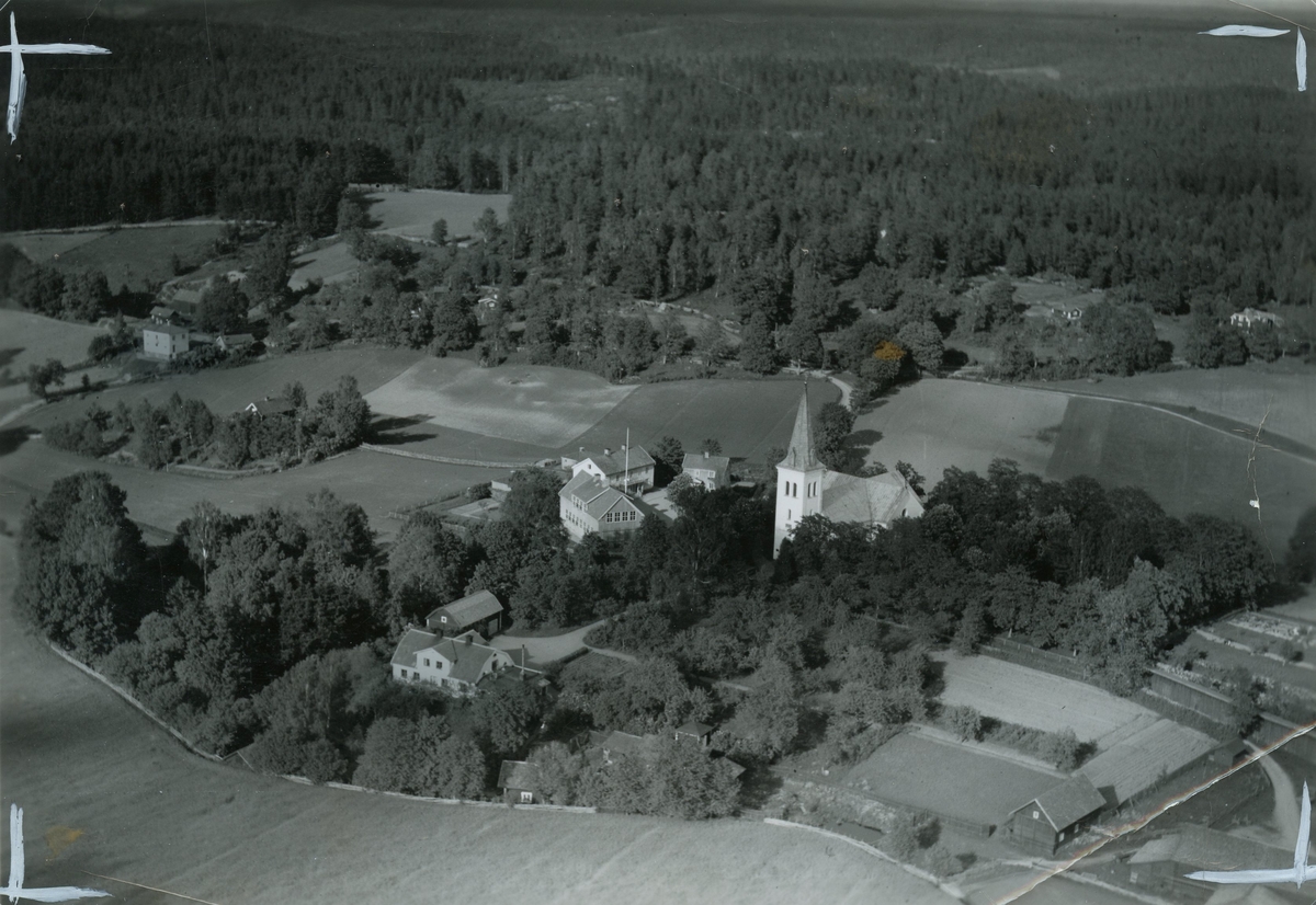 Vy över Misterhult.Hembygdsgården Grönöstugan med kyrkan och åkrar samt skog.