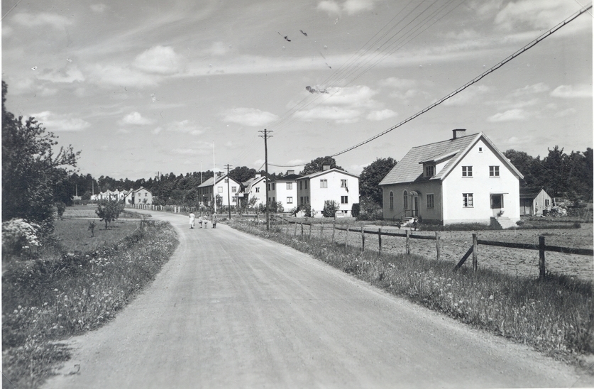 Vy på en grusväg med bostadshus och en kvinna med barn.