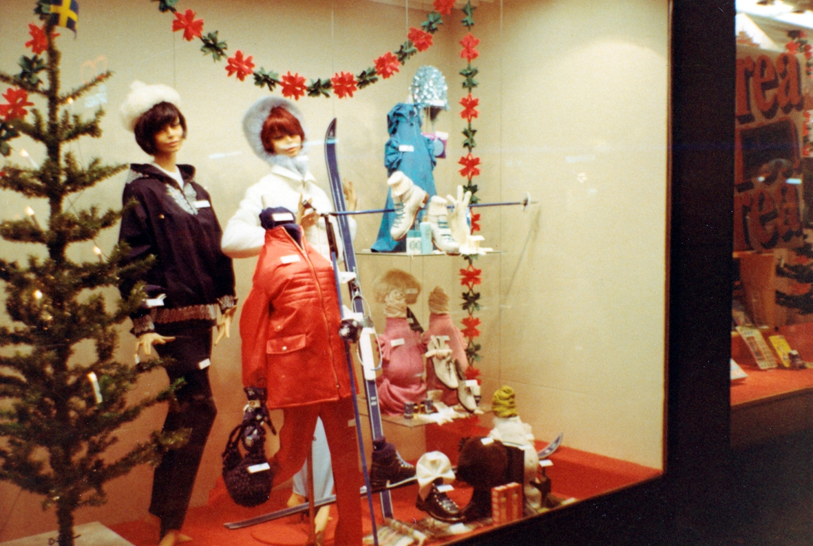 Julskyltning med sportmode i Domus fönster i Kalmar, 1967.