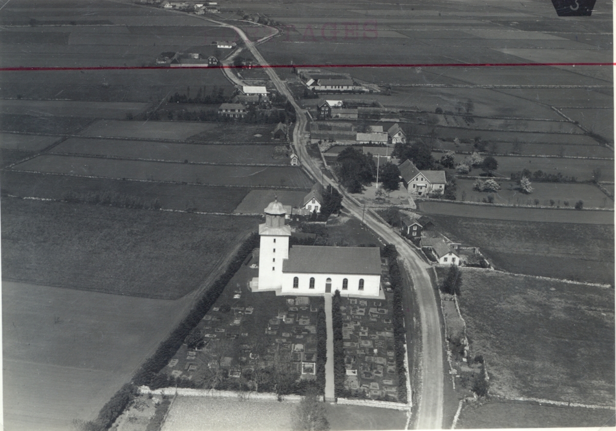 Flygbild över Stenåsa kyrka från söder. Märk kyrkogården med "individuellt anpassade" gravplatser. I bildens överkant syns tydligt hur landsvägen rätats.