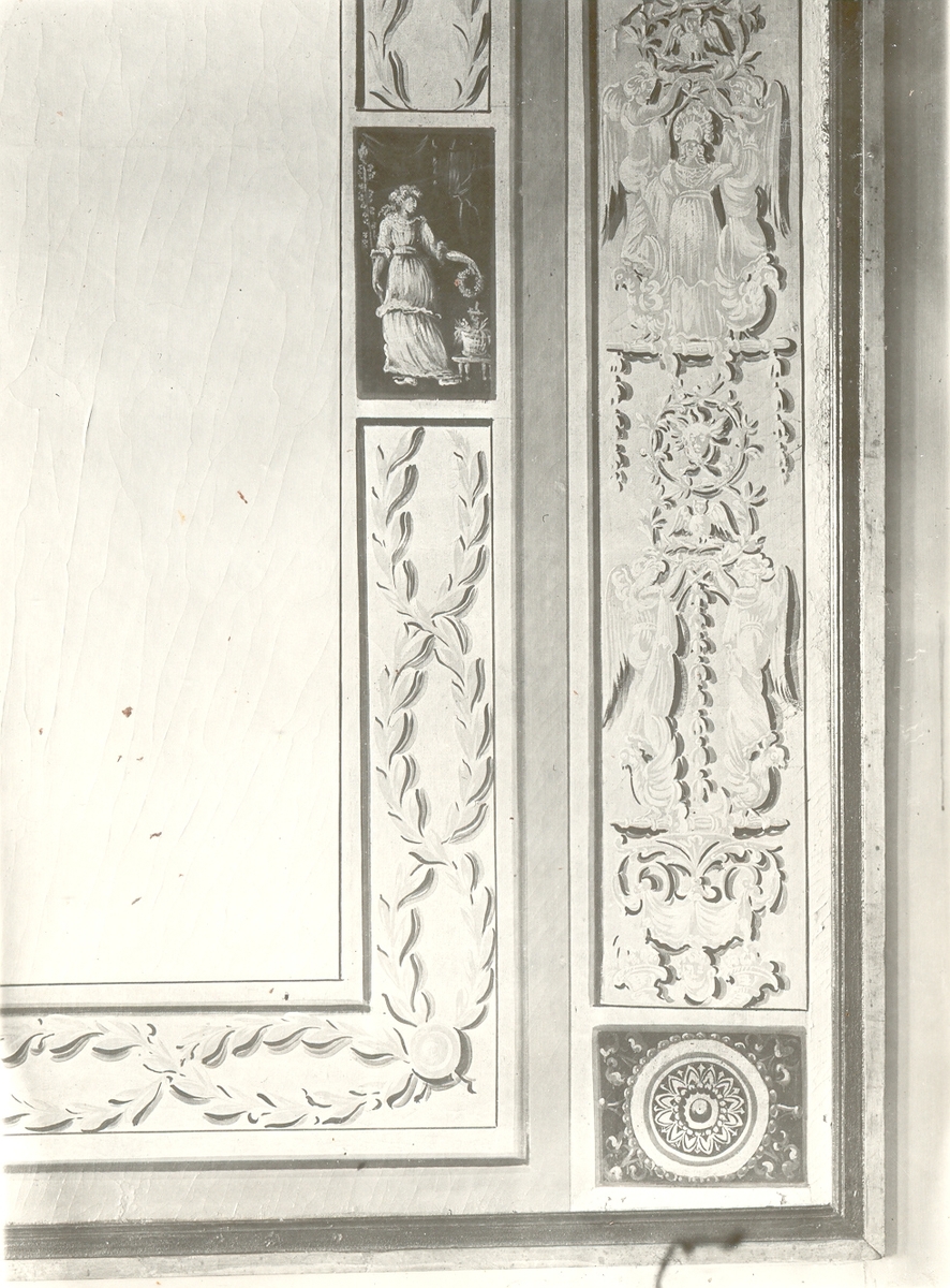 Interiör från Vinö herrgård, salongen i övre våningen. Väggdekoration, olja på väv. Bröstpanel av trä, vitmålad. Väggfältens ytor grå. I ramverkets rankor och kandelaberuppställningar i grågrönt och vitt med röd skuggning. Figurscener i brunt och vitt på brunt. Kakelugn med rosafärgad dekor.