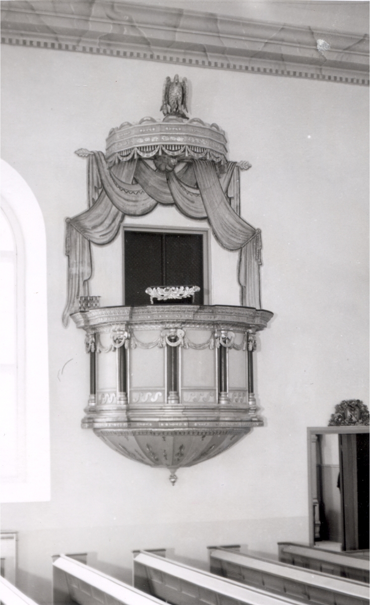 Predikstolen i Mönsterås kyrka efter restaureringen. Konservator Sven Wahlgren, 1939.