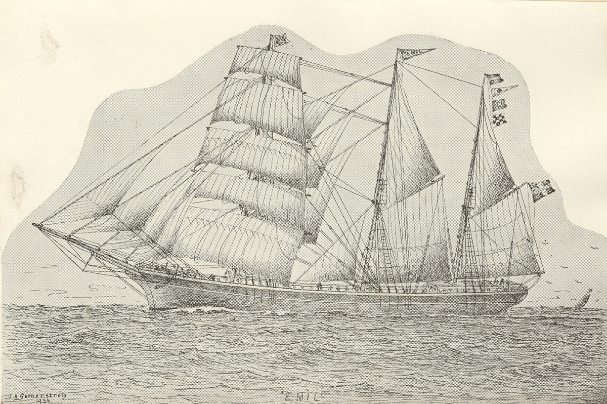 Titel: Emil, skonertskepp, 340 br.ton . Byggd 1859 i Vegesack, förbyggt 1875. Ursprungligt barkskepp. Ex "Norma". Såld från Tyskland till Danmark 1875. År 1894 inköpt till Oskarshamn av AB Petre & Co. , Vid 1900-talets början såld till Roslagen. Förlist 1907. Teckning av J.H.Götherström. Se "Vår gamla segelflotta", XI, Oskarshamn-Tidningen 26.10.1934.