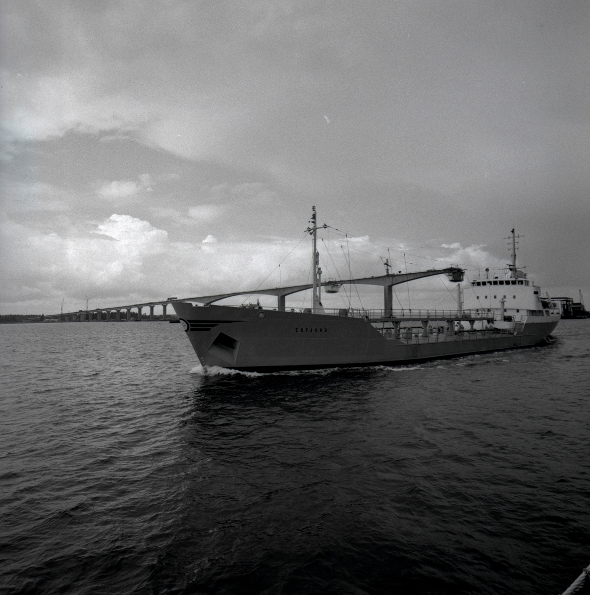 Vy från byggandet av Ölandsbron. Ett fartyg passerar i rännan under den halvfärdiga bron.