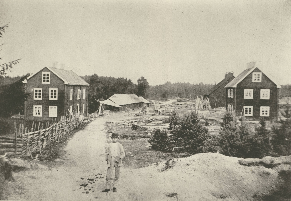 Pukebergs glasbruk. Till vänster boningshus och lagerskjul. Till höger äldsta hyttan, nerbrunnen 1888, och arbetarbostad, nerbrunnen 1895.