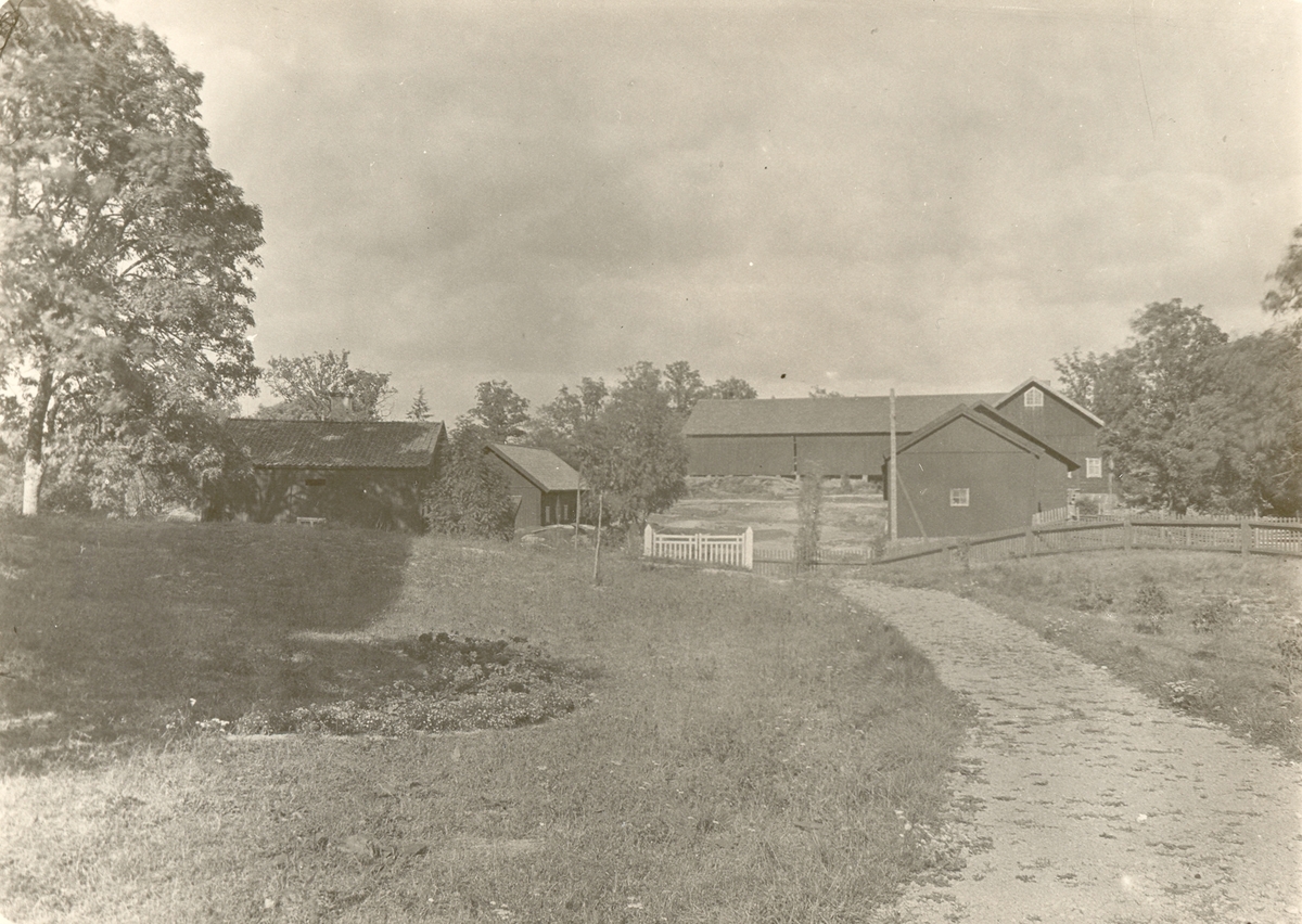 Ladugården, från mangården. I sänkan en häck, över vilken en liten stenbro leder.
