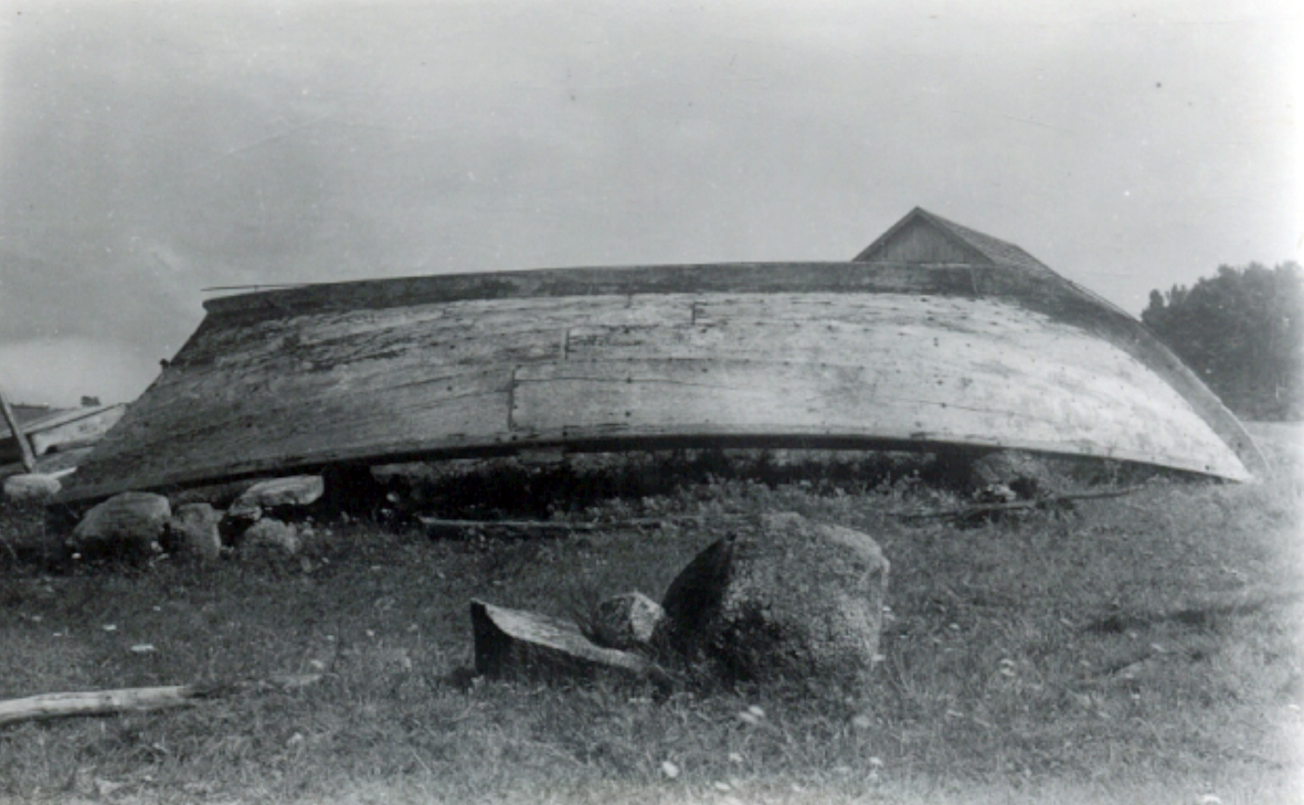 Fiskebåt av ek, med akterspegel. Upplagd ("condemned").