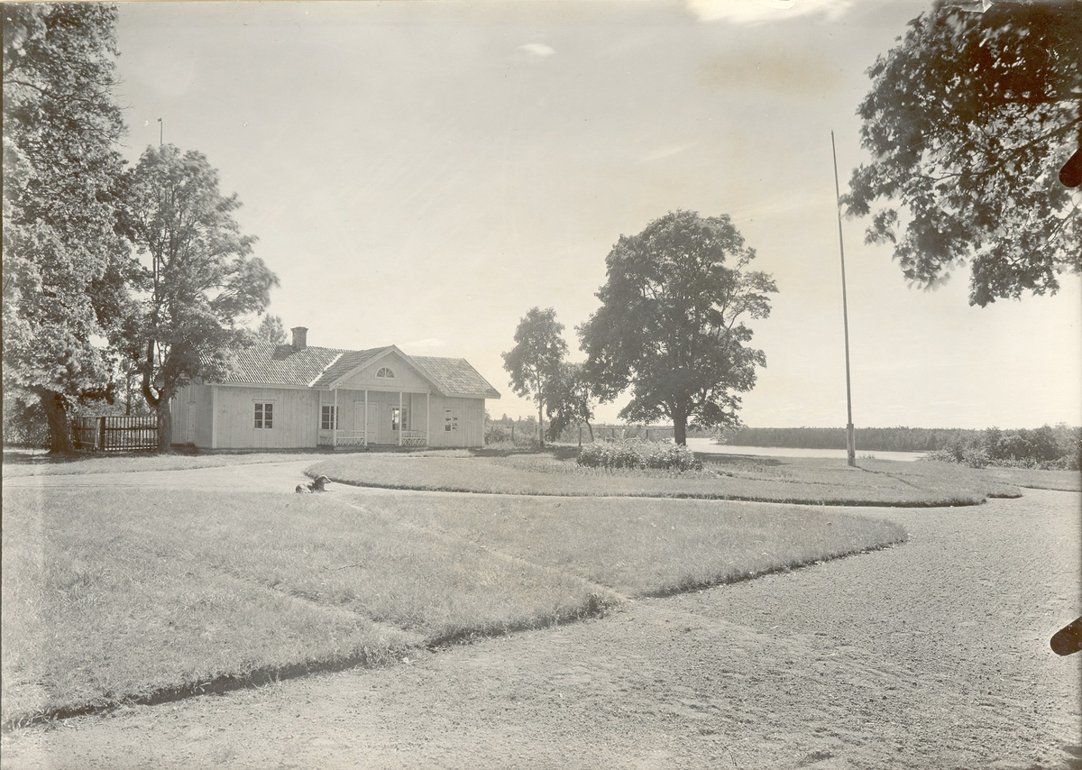 Gårdsplanen med byggnad liggande mitt emot huvudbyggningen. Lär tidigare ha legat längs branten, alltså där flaggstången står.