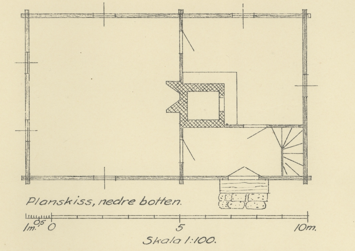 Manbyggnad. Längd 11,0 m. Bredd 6,50 m. Nästan precisa mått. Mellanväggens avstånd från köksgaveln 4,85 m. Förstuväggens avstånd från framsidan 2,05 m . Skissen i övrigt efter foto och ögonmått. Knuttimrad, brädfodrad tvåvåningsbyggnad. Härtill 2 foton av exteriör och ytterdörr.