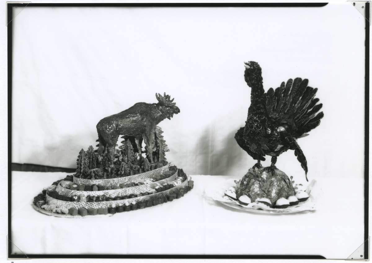 Julius Fredrikssons gesällprov hos Holmgrens konditori. Fredrikssons stora intresse var jakt vilket förklarar hans val av motiv. Älgen lär i många år ha stått i konditoriets fönster.