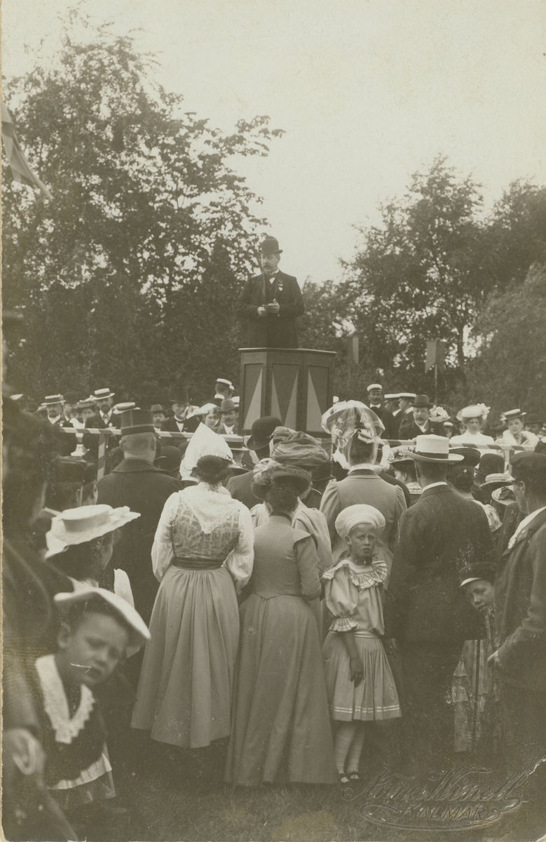 Norrgårdsparken 1909. Riksdagsman Alfred Petersson i Påboda i talarstolen.