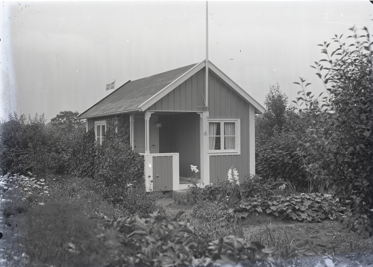 Titel: En stuga vid Kalmar södra koloniområde, fotograferad omkring 1930. Kalmar södra koloniförening grundades 1917 och har idag 105 kolonilotter. Området ligger strax söder om länssjukhuset i Kalmar med huvudingång från Stensbergsvägen.