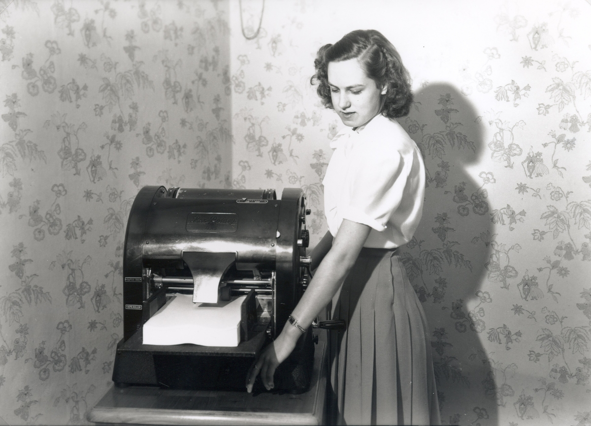 Aina Andersson född Åkesson har här just börjat på Köpmannaförbundets kansli 17-årig. Hon var född 1933 och stannade tills hon gick i pension 1/5 1997.