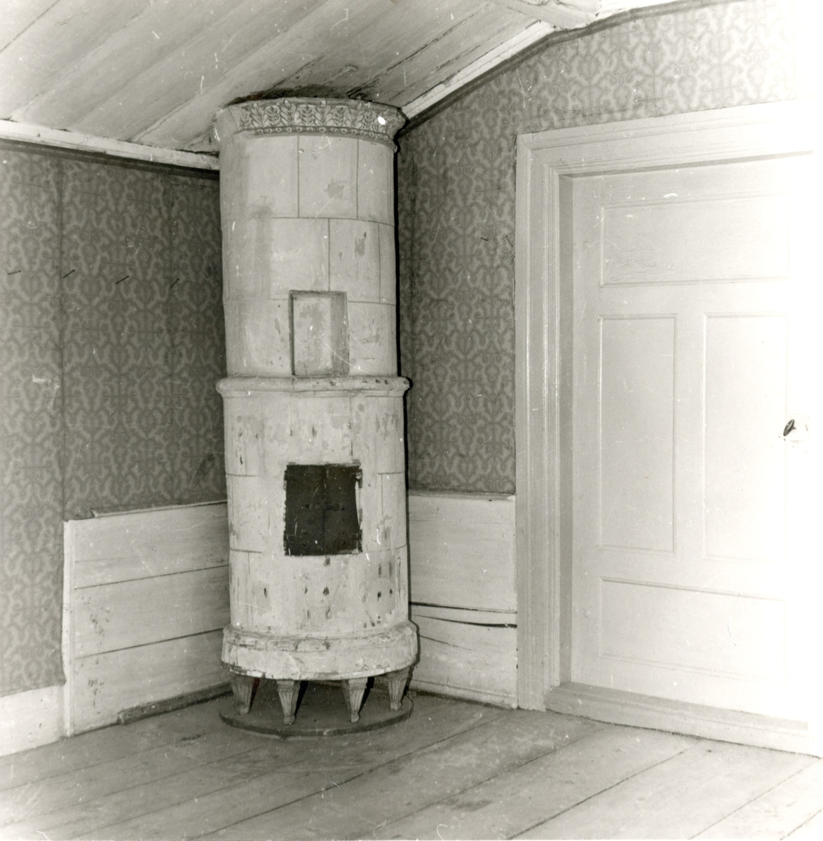 Stommen, huvudbyggnaden. Kakelspis på träfötter. Övervåningen. Kaklet övermålat med krita. På mitten har kakelspisen en liten nisch. Träfötterna och bottenplattan av trä har bevarats.