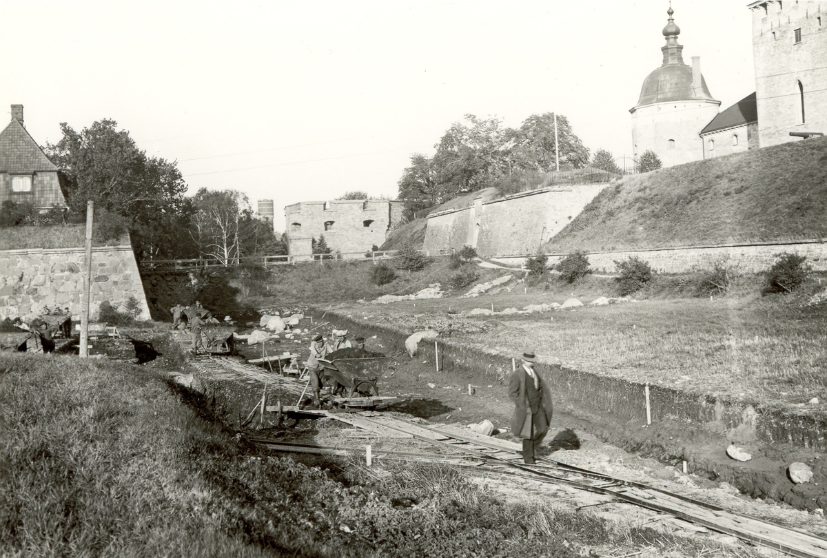 Utgrävningen i Slottsfjärden (1932-1934) under ledning av Harald Åkerlund. Det organiska materialet som hittades vid utgrävningen hade bevarats väl på grund av den syrefattiga leran. Fynden bestod av ett flertal fartyg samt mindre fynd som keramik, handskar och skor. Fyllmassorna användes sedan för att bygga upp nuvarande Tjärhovet.