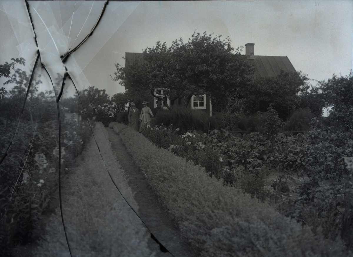 Vid husknuten står tre äldre damer. Till vänster om den välansade trädgårdsgången syns två stycken bikupor. Taket på stugan är av tjärpapp och ribbat.
