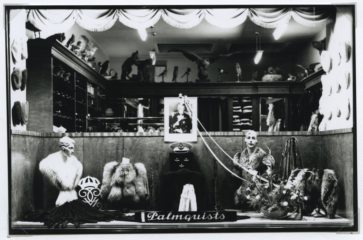 Skyltfönster för Albin Palmqvist, hatt, möss och pälsaffär.