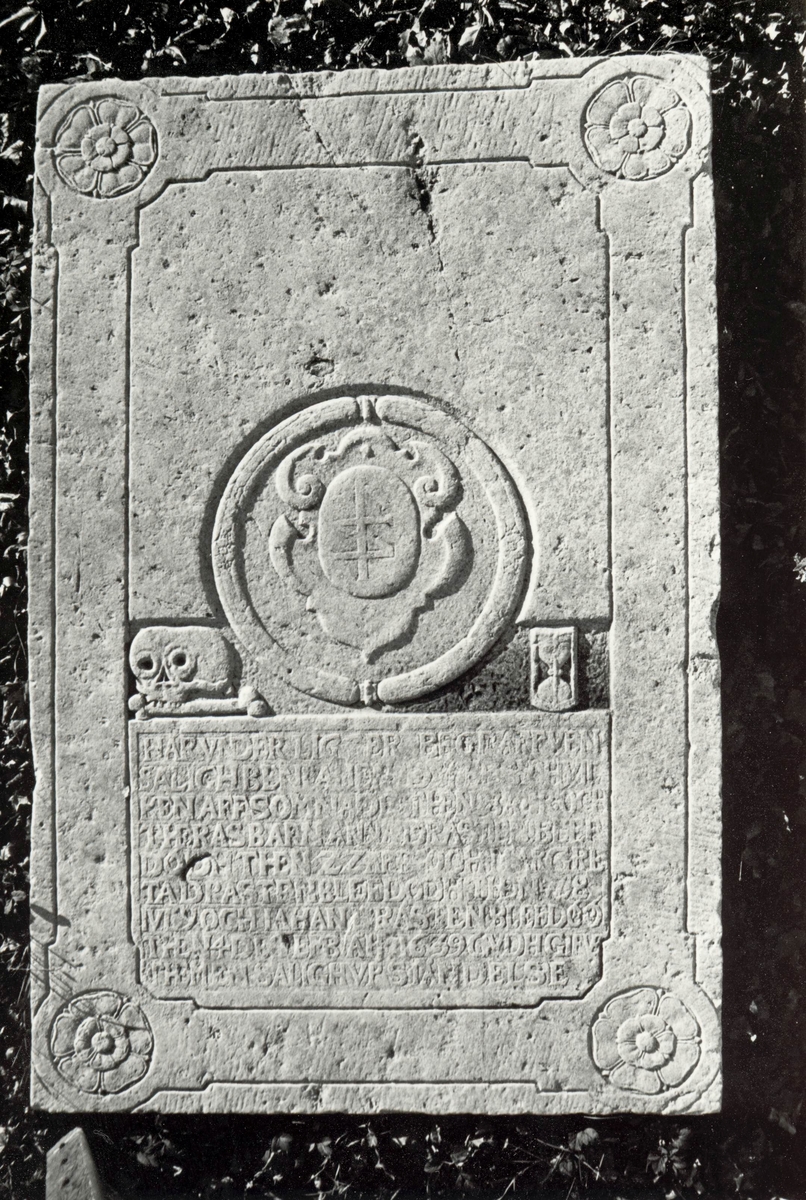 Vid kransens nedre del finns försänkta fält: t. vänster - en dödskalle, t. höger - ett timglas. Därunder en textruta med upphöjd text: "Här under ligger begraffven saligh Beniamen D Y hvilken afsomnade then 8 apr och theras barn Anna Dråsten blef dödh then 22 apr och Margreta Dråsten blef dödh then 28 iuly och Iahan Dråsten blef död...