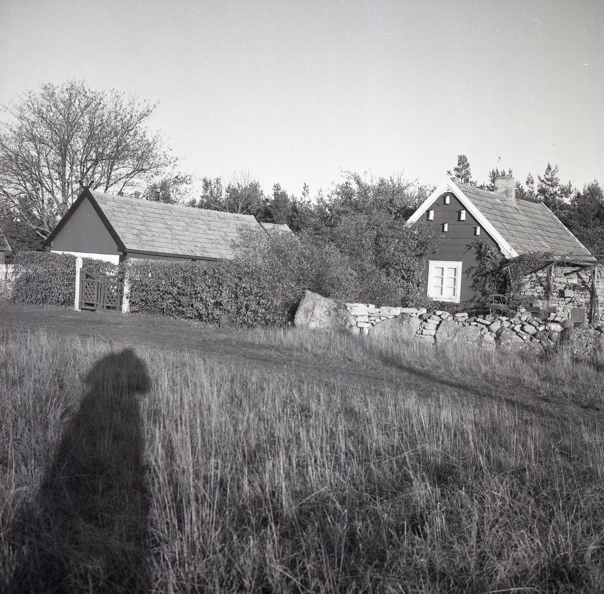 Ett bostadshus och en ekonomibyggnad bakom en stenmur i Lopperstad.