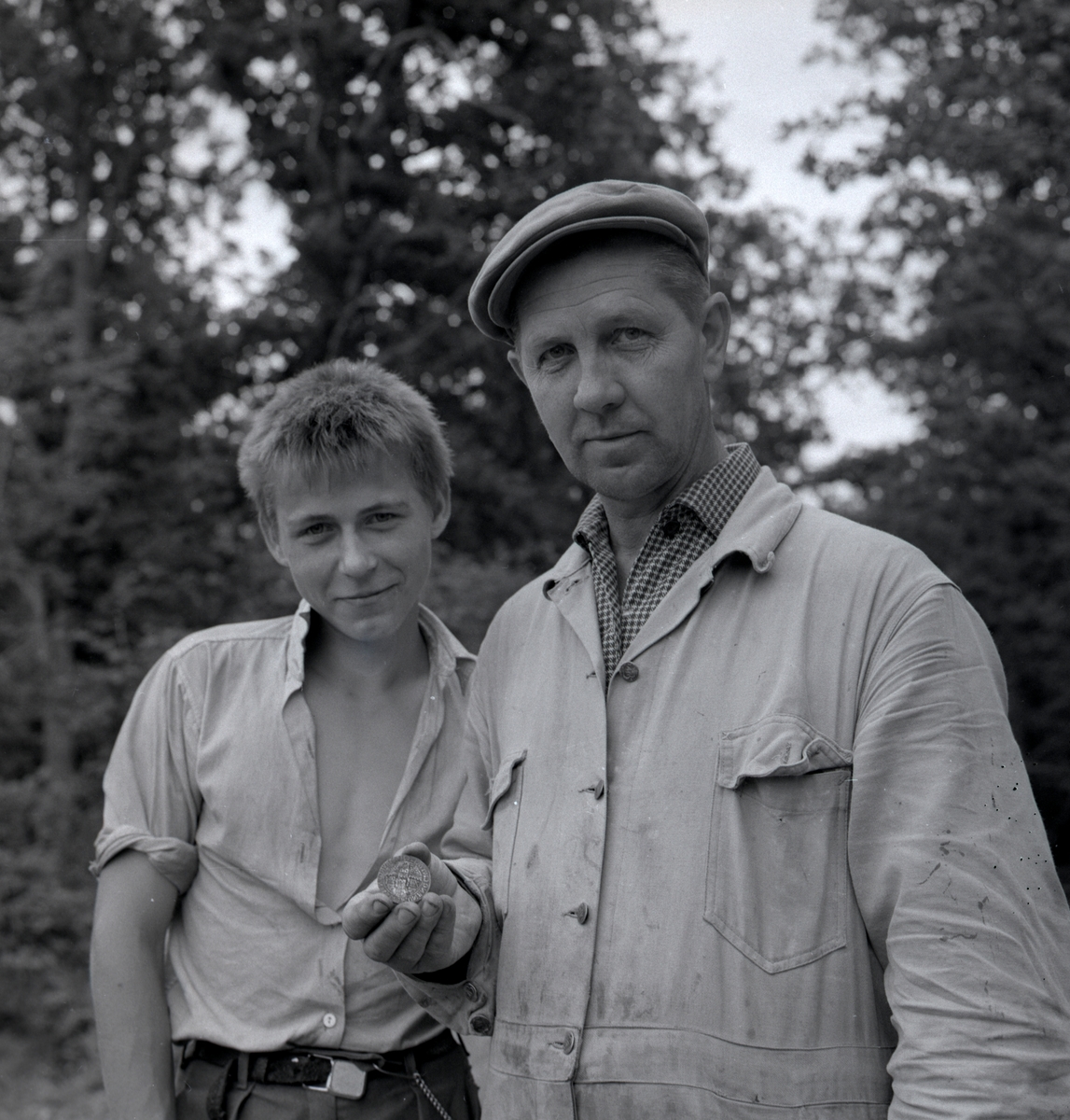 En pojke och en man som håller i ett mynt vid en arkeoloisk undersökning.