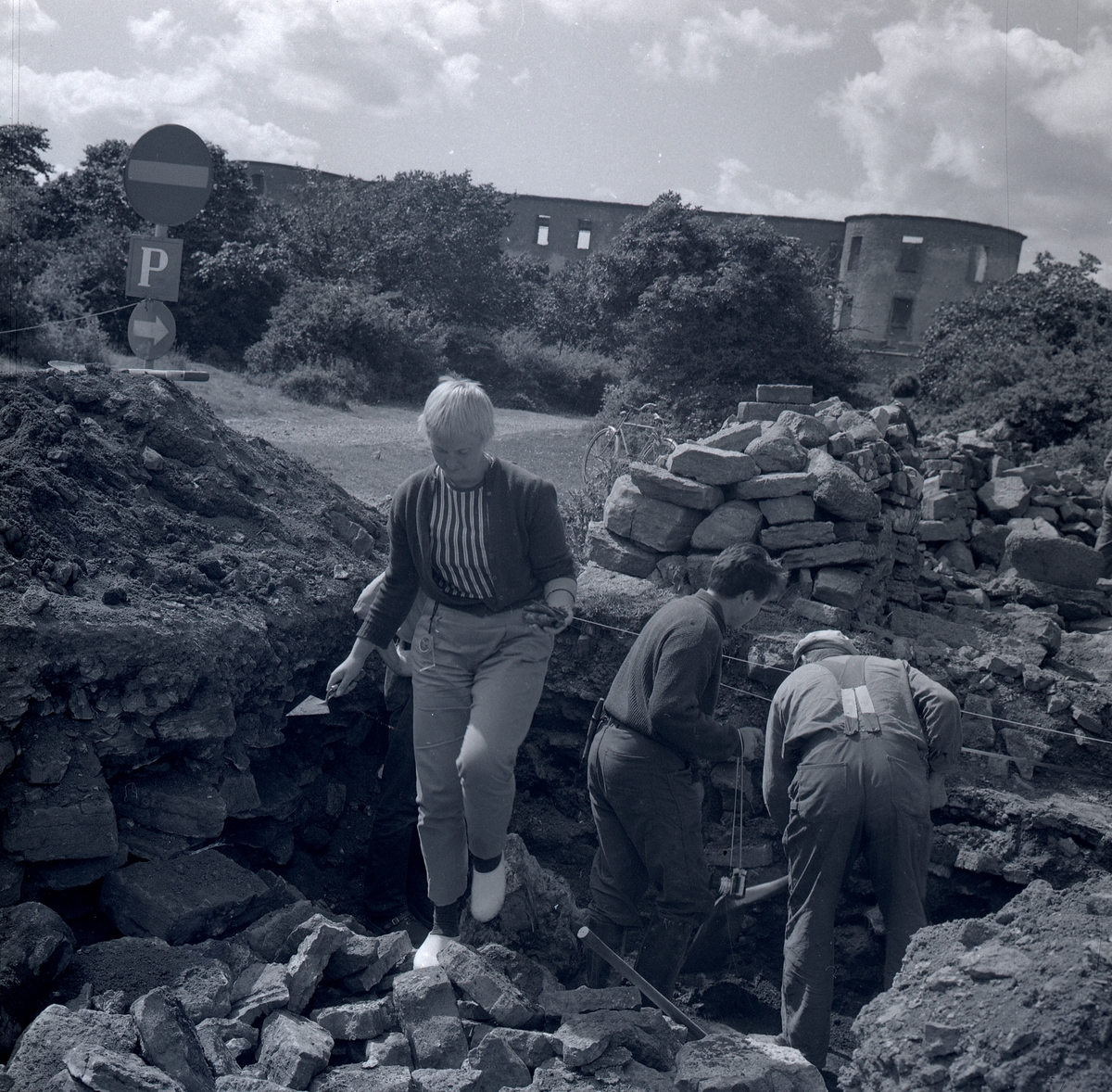 Titel: Arkeologiska utgrävningar sydost om Borgs kyrka vid Borgholms slottsruin. Det konstaterades tre medeltida bebyggelsenivåer från 1100-talet till 1300-talets slut. Källa: Grävda minnen Från Skedemosse till Sandby borg. Redaktör Kjell-Håkan Arnell & Ludvig Papmehl-Dufay, text av Stibéus.
