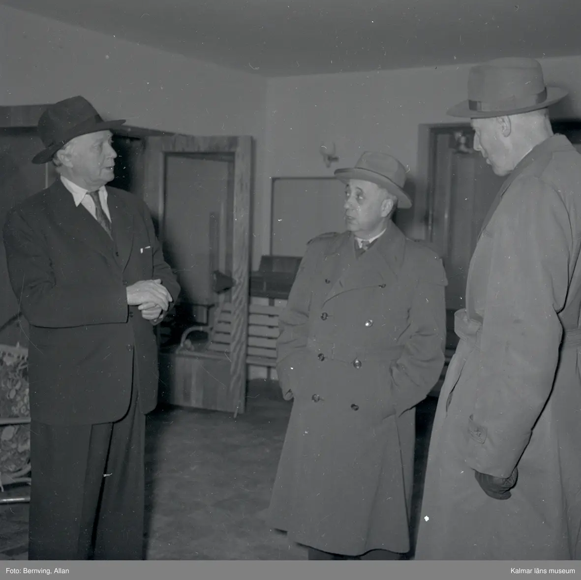Bild tagen i samband med flyktingar ifrån Ungern 1956. Tre män i rock och hatt vid ett eventuellt flyktingläger. Hösten 56 - våren 57.