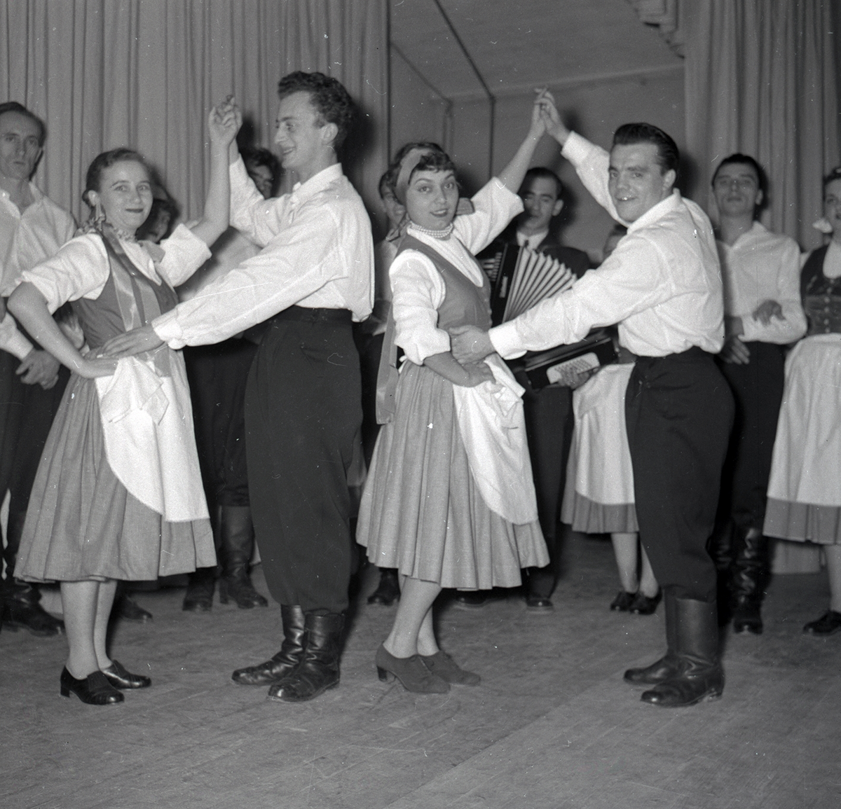 Bild tagen i samband med flyktingar ifrån Ungern 1956. Folk som dansar i förmodlingen Godtemplargården i Borgholm. Kvinnorna dansar i traditionella romska folkträkter. Hösten 56 - våren 57.