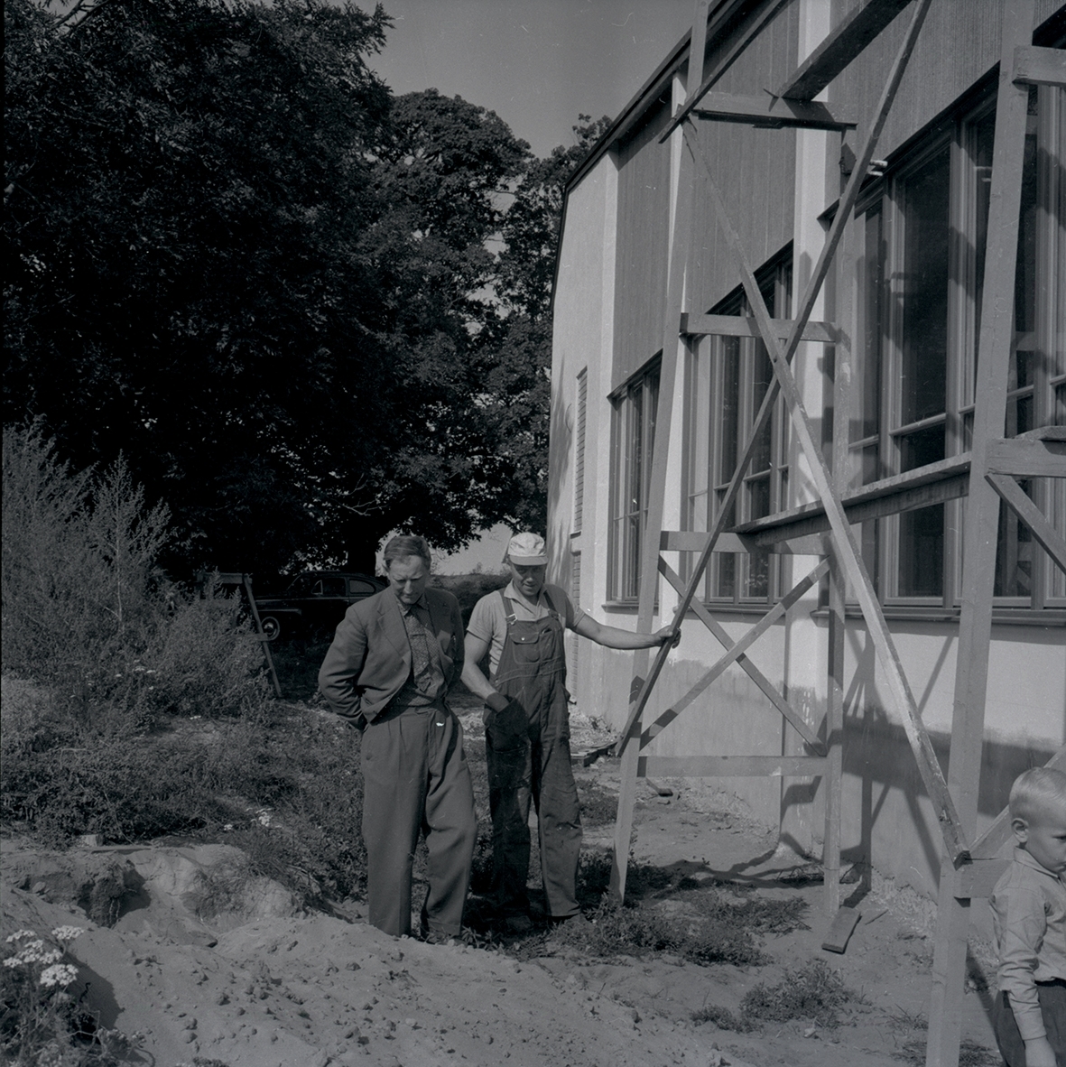 Två män och ett barn vid en byggnadställning till hembygdsgården i Köpingsvik.
