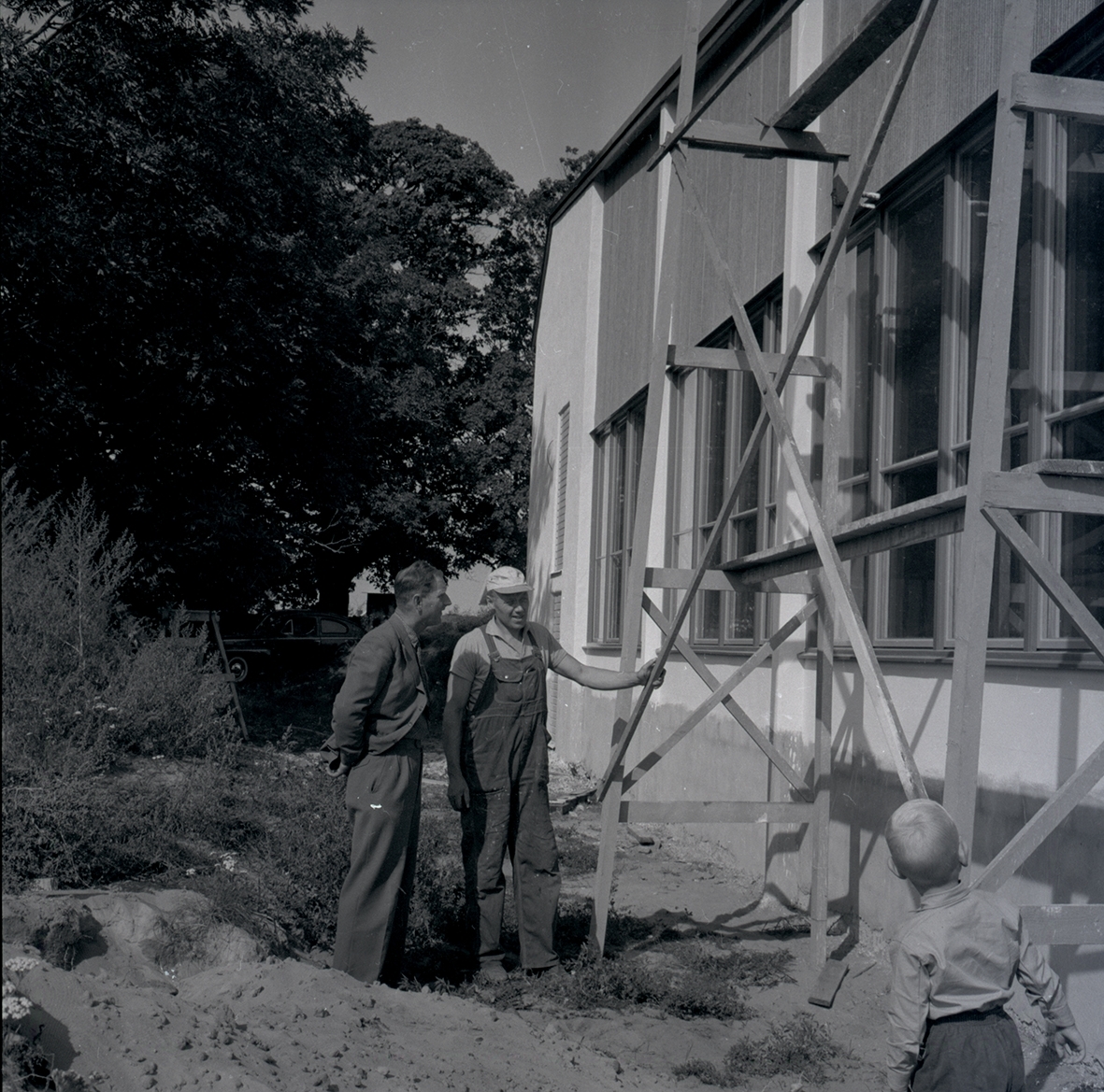 Två män och ett barn vid en byggnadställning till hembygdsgården i Köpingsvik.