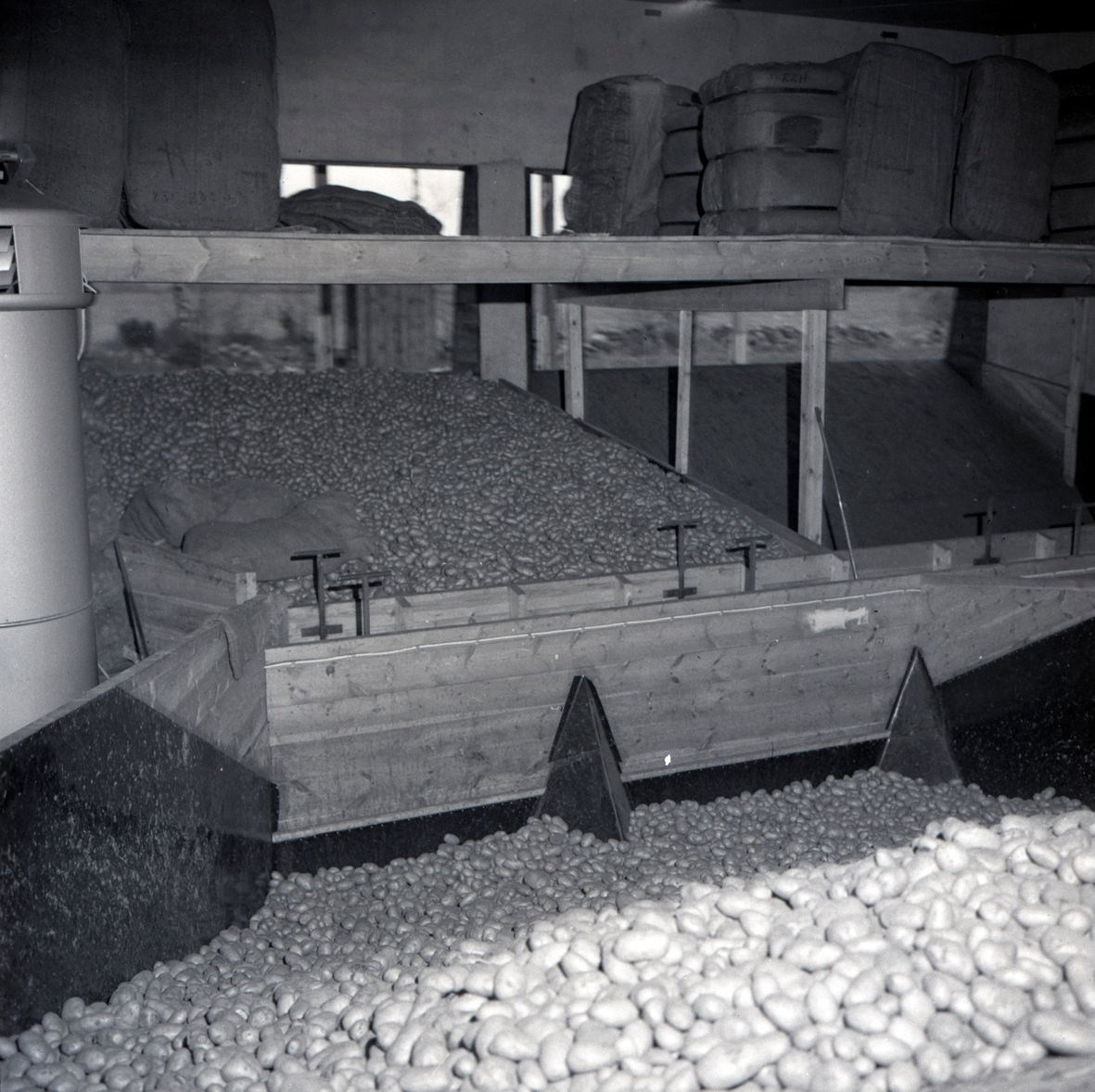 Interiör av potatiscentralen i Lilla Horn. Potatis i stora behållare.