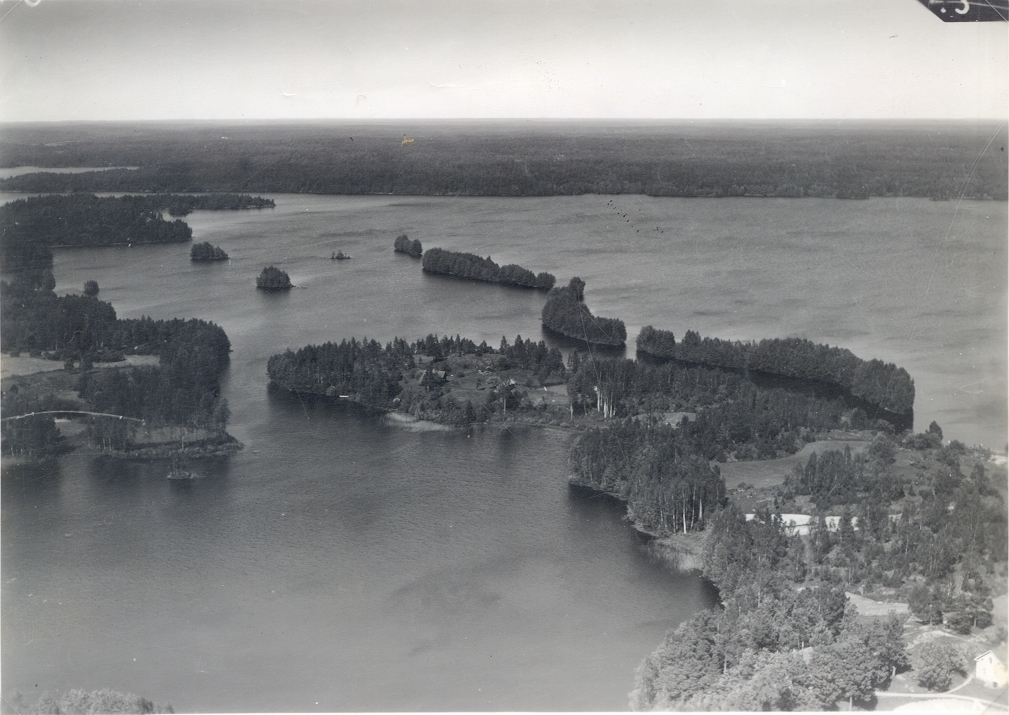 Flygfoto över Hummeln. Öar med byggnader och skog.