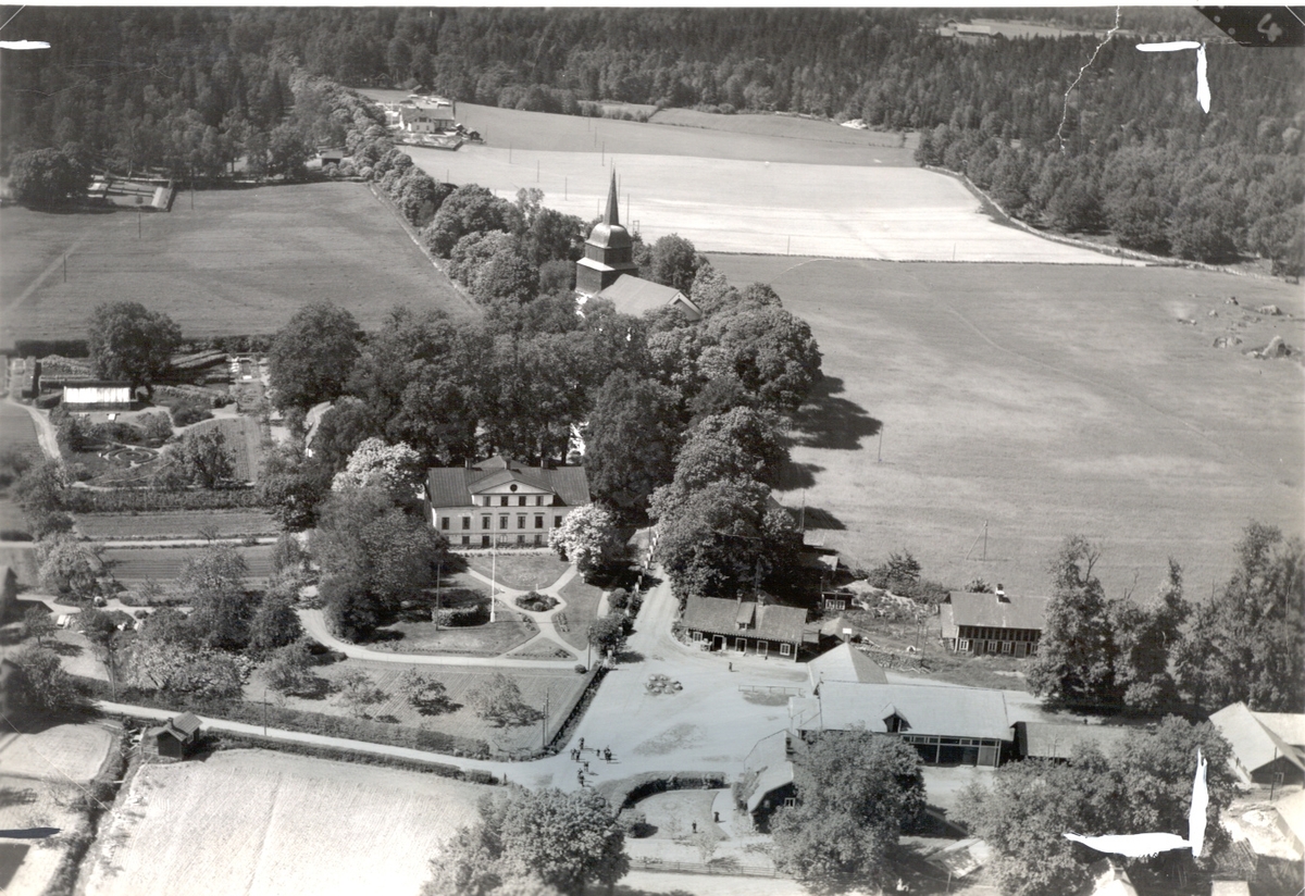 Flygfoto över Tuna. Samhället med herrgård kyrka och åkrar samt skog.