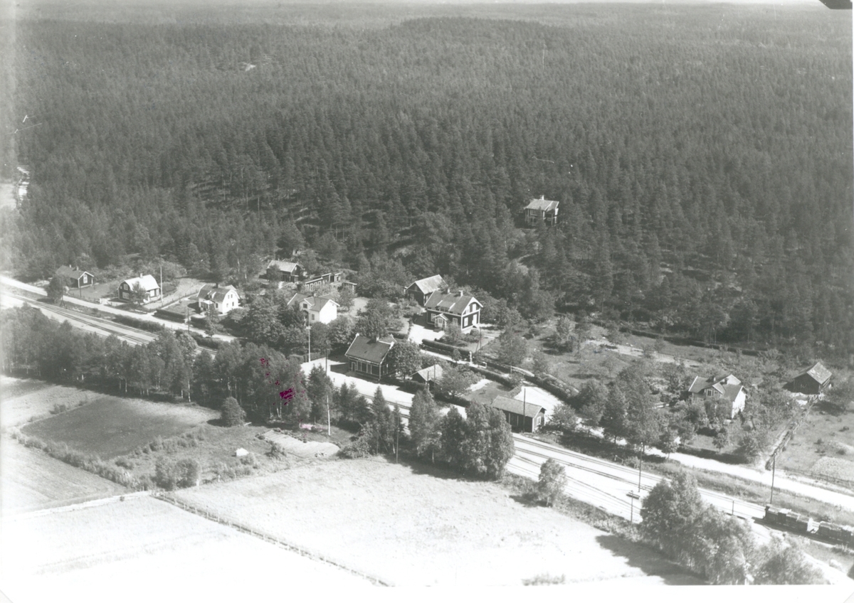 Flygfoto över Tuna, Spångenäs. Samhället med järnvägen bostäder och skog.