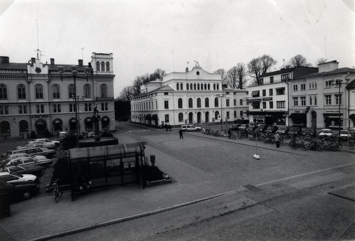 Frimurarhotellet och teatern på Larmtorget. När bilden togs användes torget som parkeringsyta.