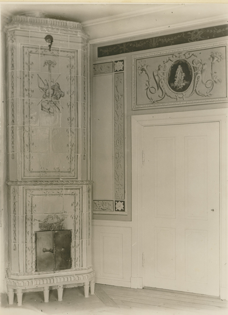 Dekorerad kakelugn och dörröverstycke på övervåningen i Fredriksbergs herrgård.