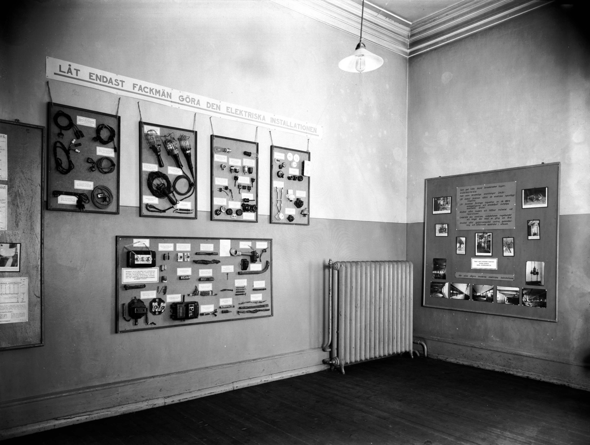 Informationstavlor om brandskydd vid en utställning av Svenska brandskyddsföreningen.