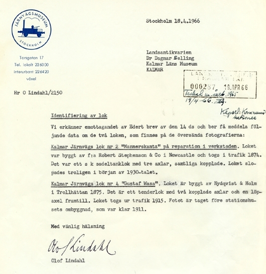 Brev från Järnvägsmuseum, Stockholm, till landsantikvarien Dagmar Selling.