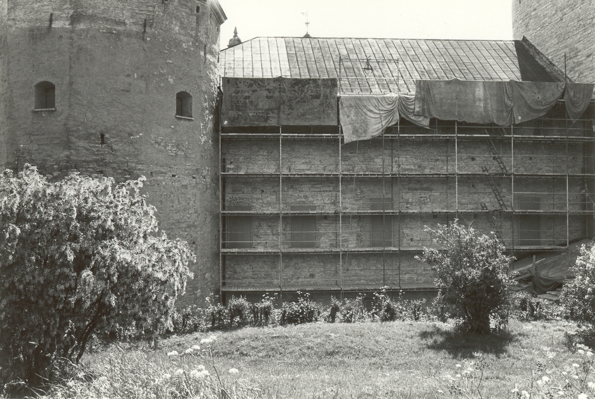 Västra fasadens norra del mellan Kungsmakstornet och Kuretornet. Foto från vallens yttre kant.