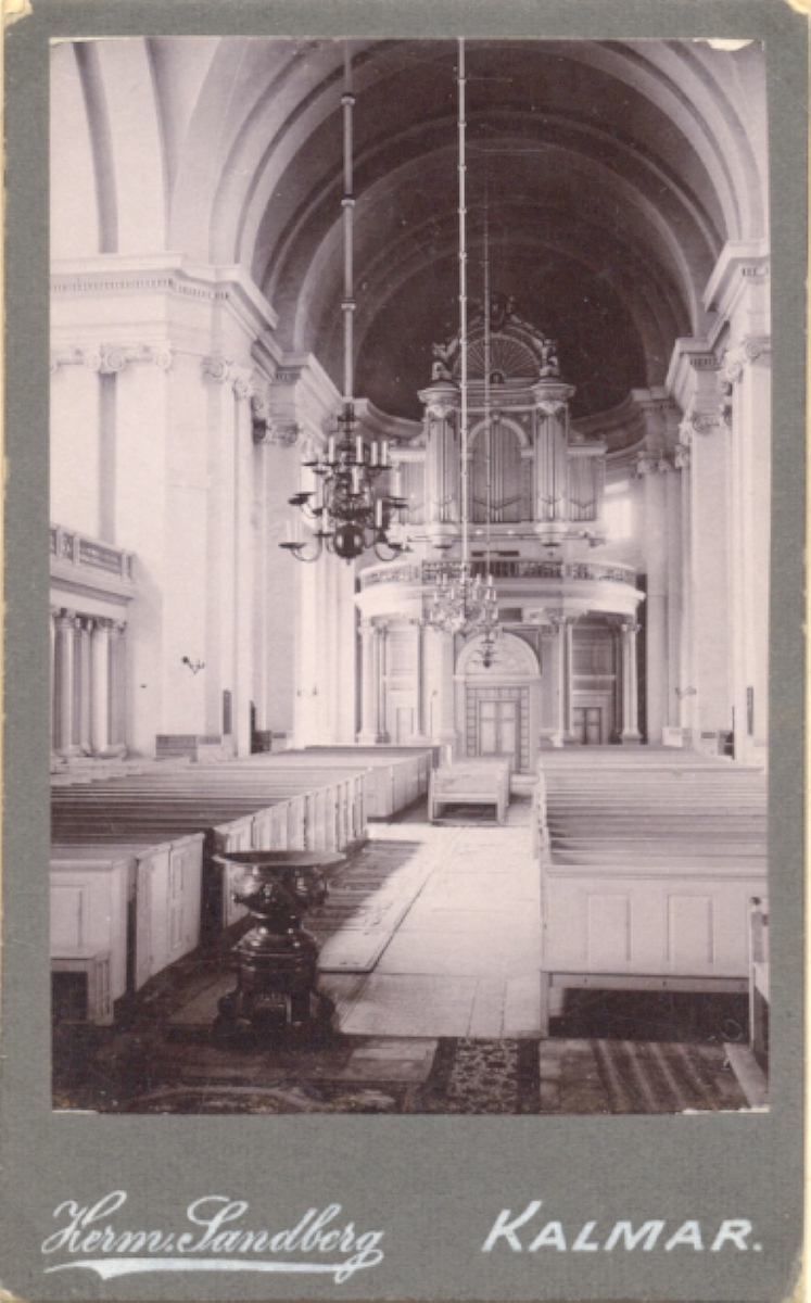 Interiör av Kalmar domkyrka före renoveringen 1914. Notera dopfunten liksom att epitafierna saknas. De var ännu på slottet.