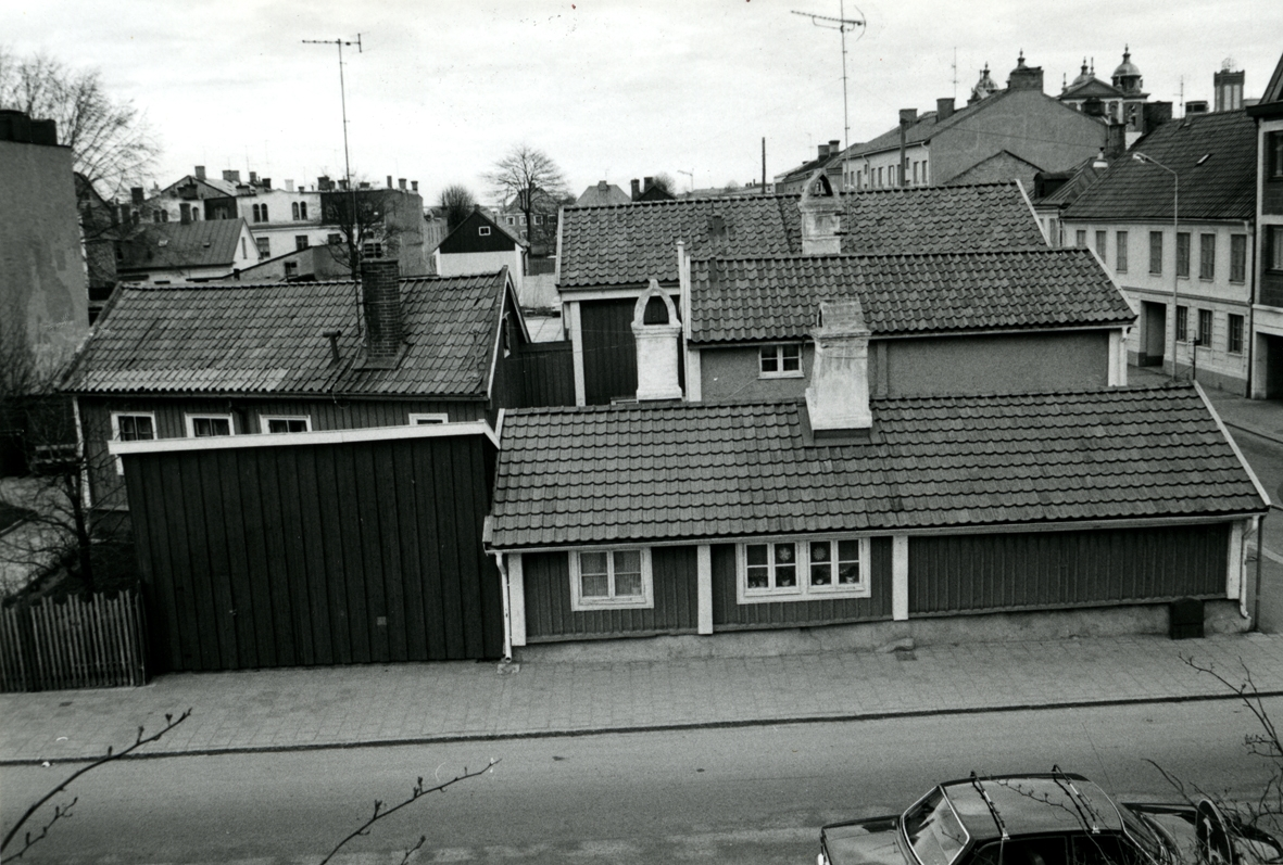 "Tripp,Trapp,Trull" vid Korsningen Larmgatan - Fiskaregatan. Gårdshuset t.v. ligger med gaveln mot den forna Norra Vallgatan och i Larmgatans gamla sträckning.