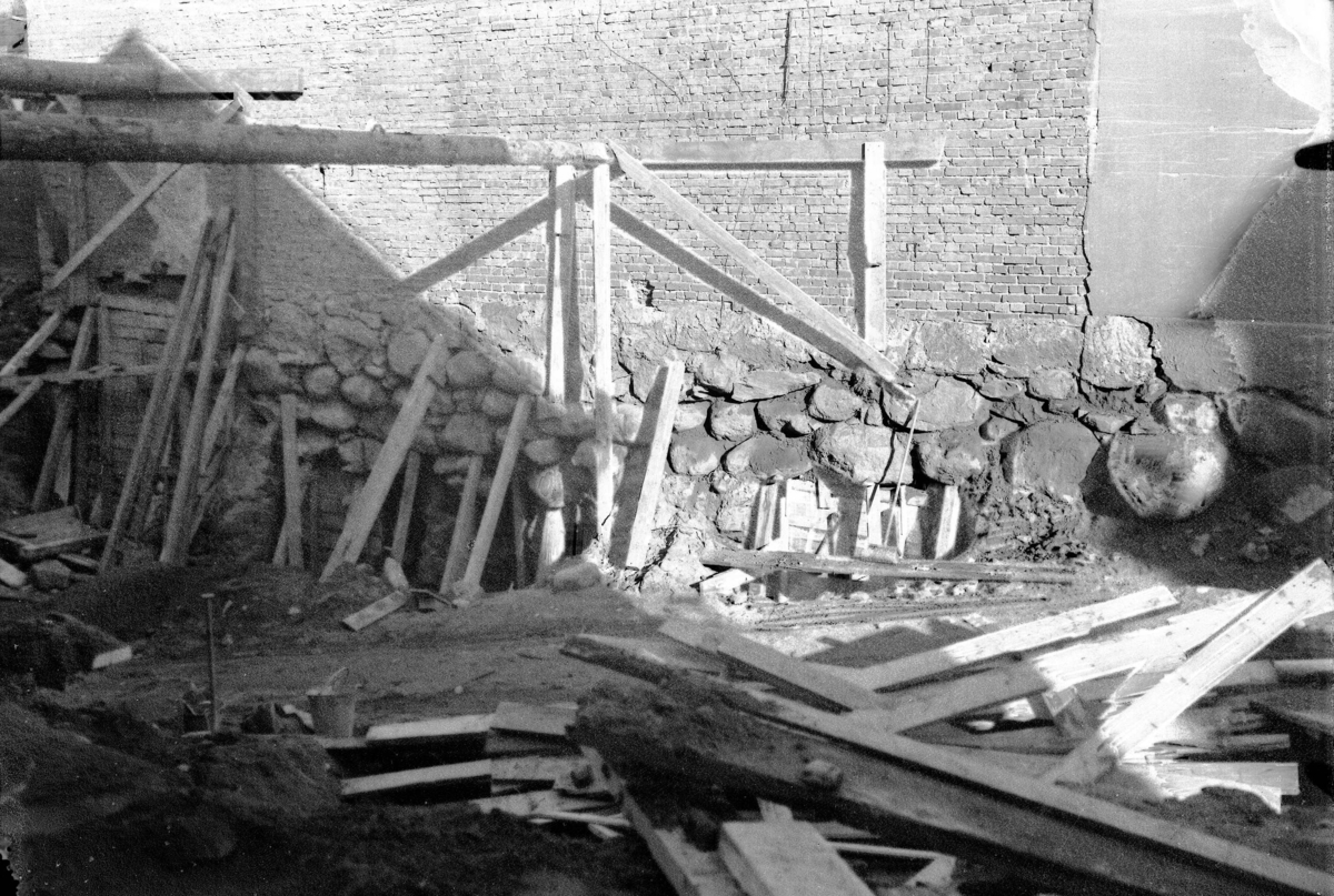 Bild på reglar, tegelvägg, mur och rivningsmaterial vid en rivning. Enligt Walter Olsons journal är bilden beställd av Skånska cement.