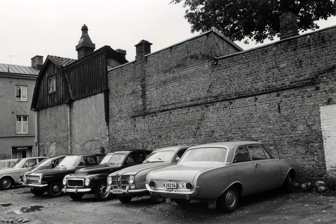 Byggnaden från den avrivna tomten i Gesällen. Här syns tydligt husets olika byggnadsfaser. Till det ursprungliga