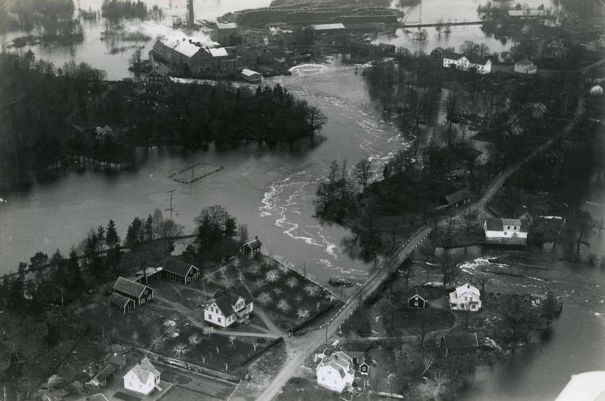 Bilden visar en översvämning i Emsfors 1935. Emån har uppenbarligen svämmat över med besked. I bildens överkant syns Emsfors pappersbruk med därtill hörande lager av timmer.