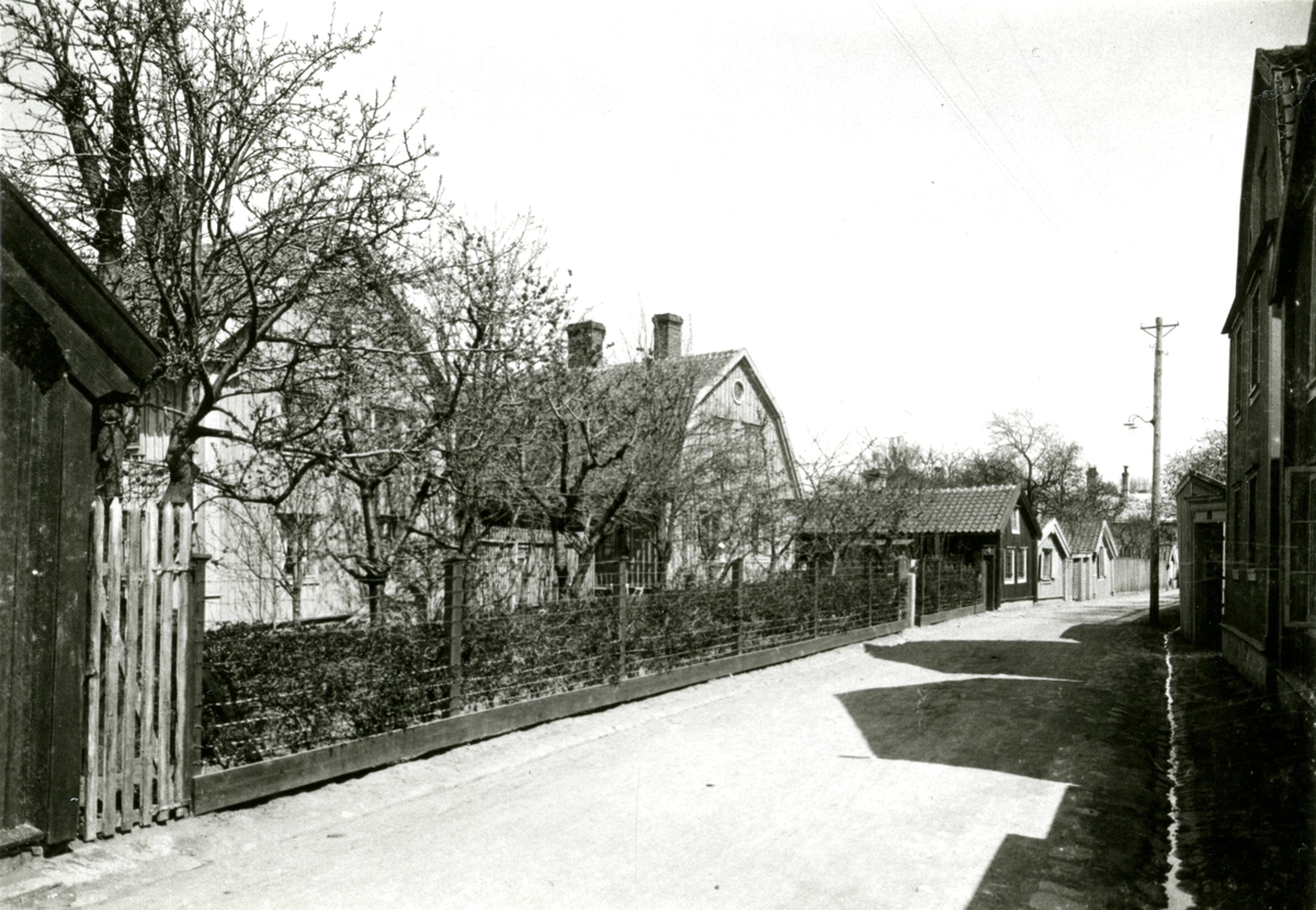 Kvarteret Alen i Gamla staden. Molinsgatan med bostadshus i träfasader. En grind och häck med stängsel markerar tomternas gräns till gatan.