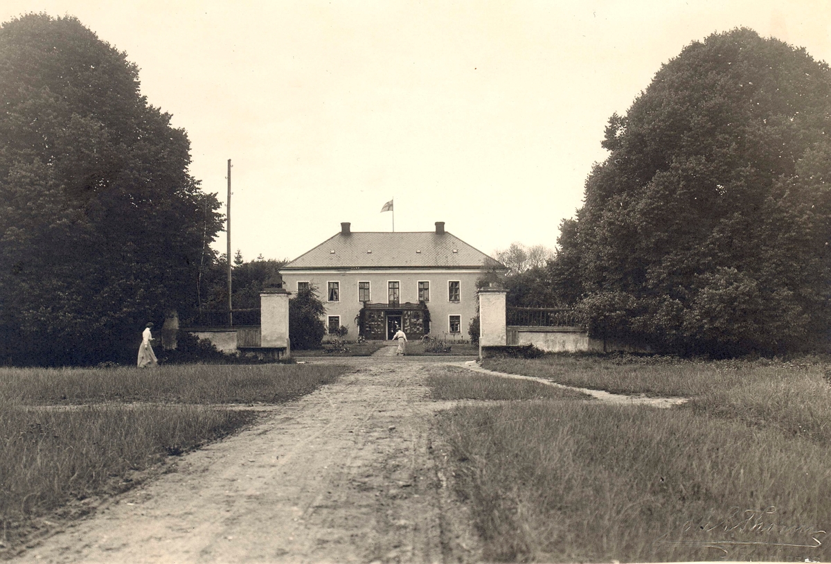 Mangården från öster. Mur samt portstolpar med ryttare i krönet.