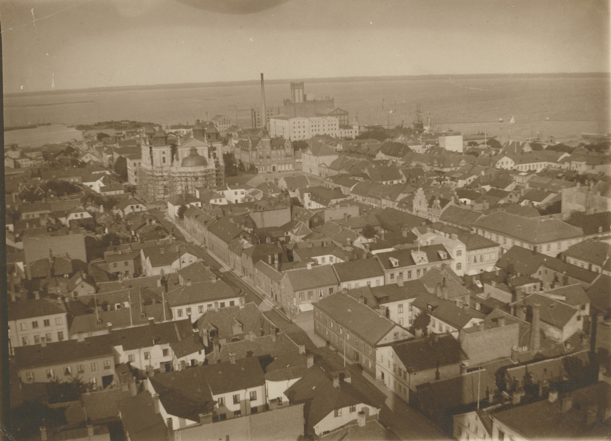 Kalmar från Gamla vattentornet. En byggnadsställning runt Kalmar domkyrka.