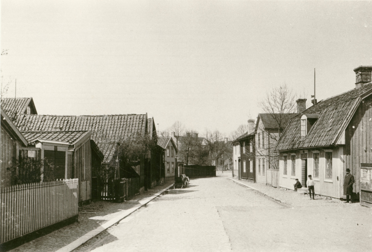 En gata med bostadshus. Till vänster kvarteret Bläckan, till höger kvarteret Braxen. År 1908.