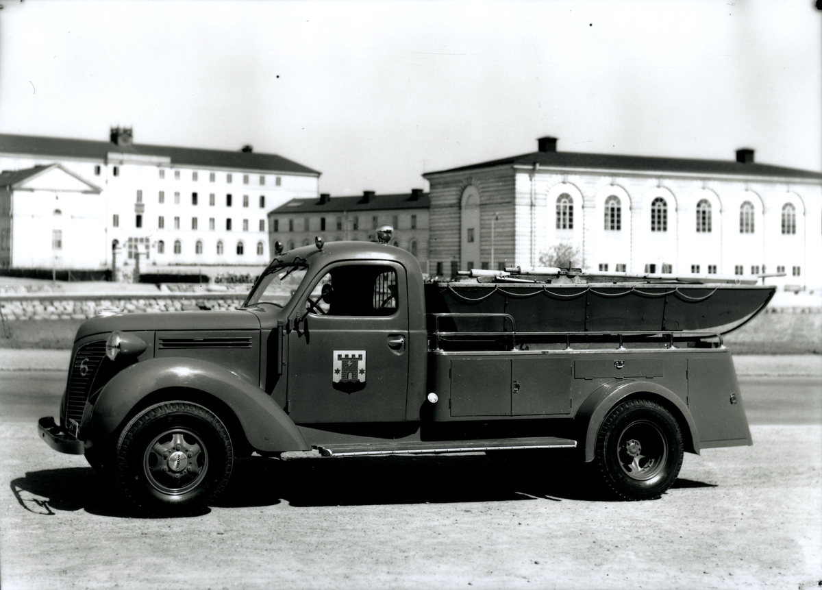 Räddningsbil med båt framför brandstationen med Stagneliusskolan i fonden.