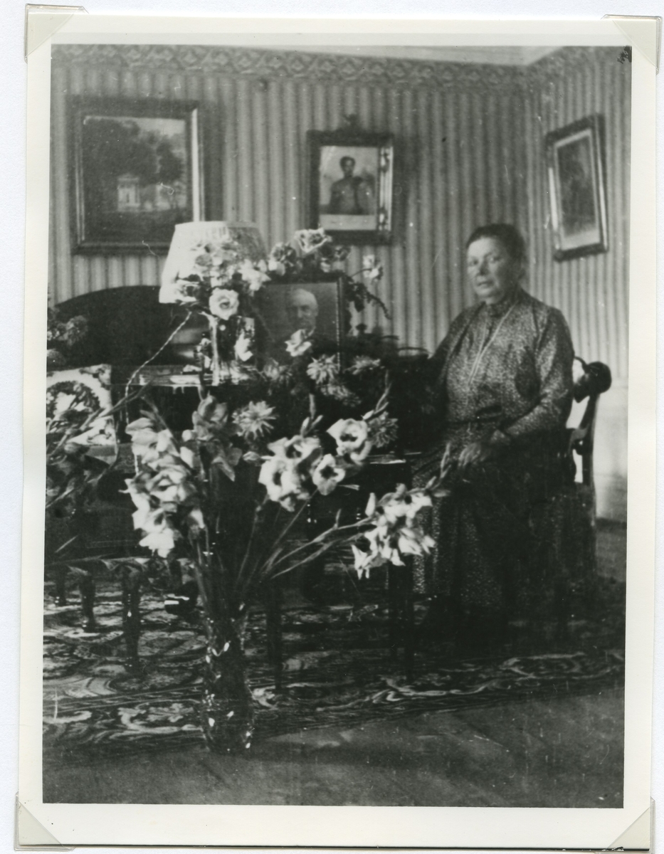 Fru Betty le Grand den 24 augusti 1930. OBS! Porträttet av Axel le Grand på bordet bredvid henne. Hon var född den 24/8 1856.